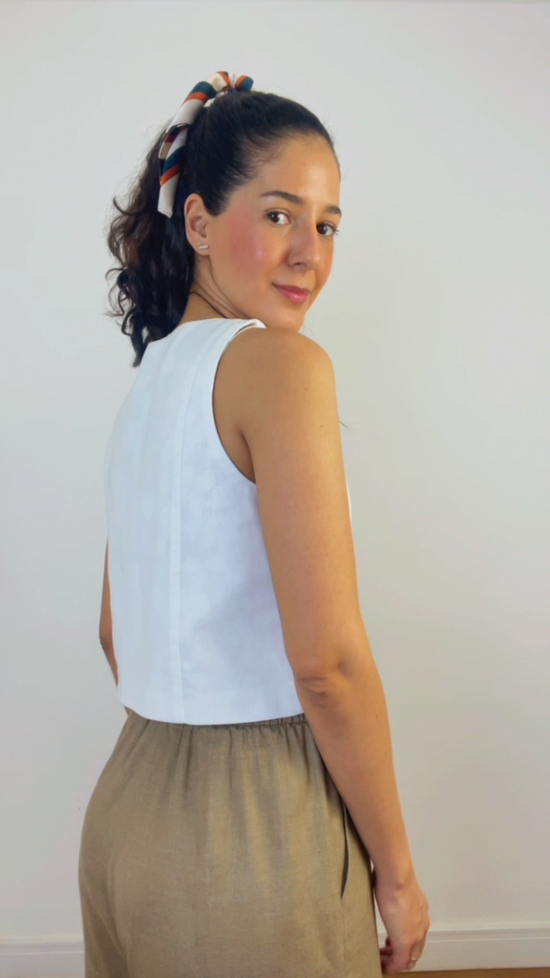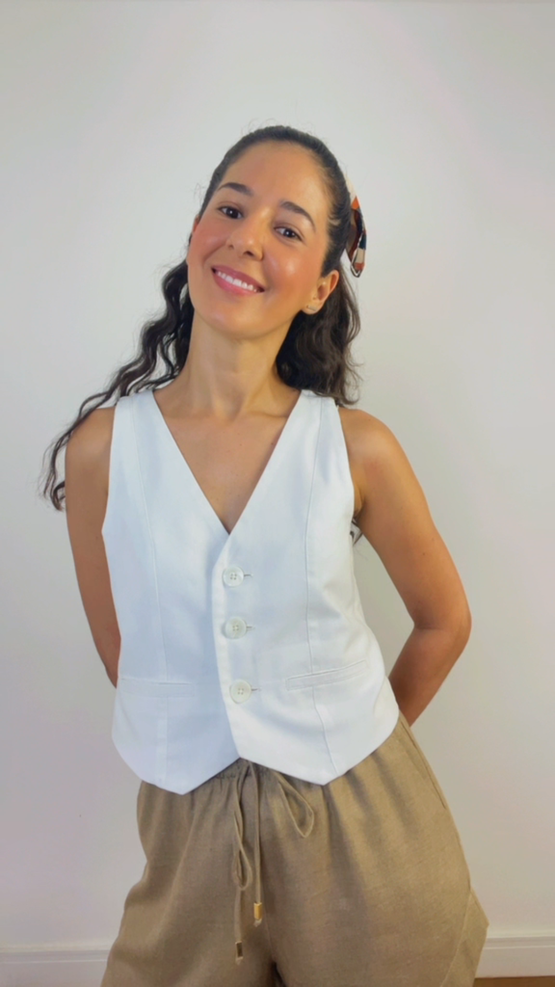 Molde do colete BELLA, um colete alfaiatado, com recortes para acinturar, botões, decote em “V” e barra levemente pontiaguda na frente. Possui bolso embutido falso e é totalmente forrado, garantindo acabamento limpo e caimento estruturado.
